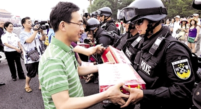昨天下午,李瑞英、朱軍、郎永淳等中央電視臺和北京電視臺的十多位名嘴,為正在執勤的特警隊員和交警,送去酸梅湯等夏季消暑飲品。近日,市公安局巡特警總隊,在長安街沿線及重點地區加強了巡邏防控和武裝震懾。據了解,特警們每人每天身上的槍支、防彈衣等裝備,需要負重數十公斤。“高溫酷暑,特警們還著裝整齊,一站十多個小時,他們確實是最值得尊重的。”朱軍說。 記者 董世彪 郭曉樂 攝影報道