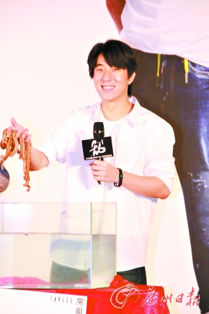 成龍雖未到場,房祖名卻請來了時下最火的明星“章魚哥”保羅來為新專輯的成績做預測。房祖名分別將“金曲獎”和“銷量突破50萬”兩個心愿牌放在兩個被罩住的魚缸前,并許愿說,“得‘金曲獎’比較現實點,章魚哥你還是選‘金曲獎’這邊的魚缸吧!”揭開幕布,“章魚哥”果然沒讓房祖名失望。他高興得立即從缸里撈起“章魚哥”,猛地一陣愛撫,隨后發現保羅沒什么精神時,房祖名緊張大呼“趕緊送‘章魚哥’去醫院治病!”(記者 程雪超 攝影報道)