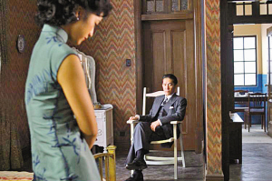幕后:為了完整重現《色,戒》中30年代場景,李安不惜花了3000萬人民幣在上海搭建了一條完整的“南京西路”,道路兩旁盡是2、3層樓的建筑,共蓋了大小180家商店。據悉,原著小說中,曾出現店家的陳年照片,李安就根據這些,再對照真實史料,仔細考究搭建,就連櫥窗內的商品也以真品放置。李安對美工的要求幾乎到了苛刻的地步,連一只杯子都要和當年一模一樣。但百密一疏,背景中的高樓影子,本應該在后期制作中用電腦刪去,卻疏忽了。