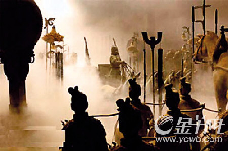 片花放畢,記者們馬上“找茬”。銀幕上一閃而過地出現了地動儀,秦陵里的兵馬俑與戰車混雜在一起,兵俑手頭都有兵器。但地動儀由東漢張衡發明,秦陵里的兵馬俑和戰車是完全分開羅列的,兵俑都空手無兵器。
