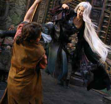 李冰冰飾演冷血白發魔女霓裳,拍攝時,要耍出“鳳舞九天”一招,最后整個身體掉在假巖而刮傷手臂和手掌,還曾半空中吊威壓飛行而傷到背部。雖然付出良多,但獲成龍大哥贊美為白發魔女的絕佳人選,李冰冰還是興奮不已。