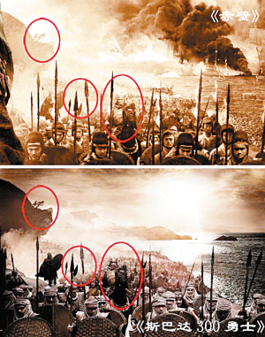 一張《赤壁》和《300勇士》的對比照昨日成為網友熱議的焦點。照片發(fā)布者圈出吳宇森新片《赤壁》官方海報中和《斯巴達300勇士》劇照的相似之處,并直指《赤壁》抄襲。對此中影營銷分公司負責人直斥“無聊炒作”,并稱“每款海報都有不同的風格。”
