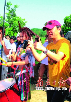 據悉,“五一”期間在成都舉辦的熱波音樂節是片中一個拍攝場景。從記者獲得的劇照來看,譚維維正率領一群裝扮火辣的鼓手,一邊打鼓一邊起舞,場面動感。而譚維維的造型也是首度曝光,她以一身清涼露臍裝亮相,加上具有民族元素的鮮艷裝飾和文身點綴,更顯火辣。尤其是她的發型卡通味道濃郁,一縷縷火箭般的沖天直發,十分夸張。