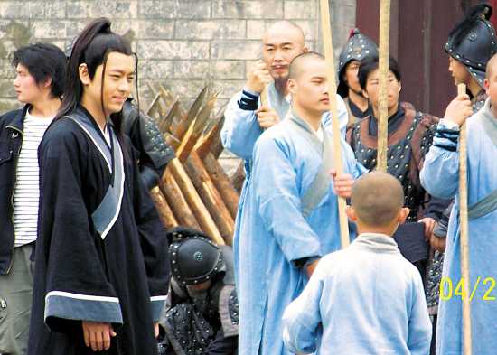 在劇里演青年皇帝的林志穎是前天下午才進劇組的。昨天中午他拍的是與元彪率領(lǐng)的少林十八僧沖出洛陽城門的一場戲。說是一場戲,記者在現(xiàn)場看到,其實也不過是幾分鐘左右的鏡頭——從“洛陽”城門徐徐打開,到一臉凜然的眾僧與林志穎抄著長棍短棒從里沖出來,然后在城門口一個亮相的定格。就這么一個場景,來來回回折騰了大約有一個多小時:城門開了,沖!重來!城門再開,再沖!還是不行,再跑!