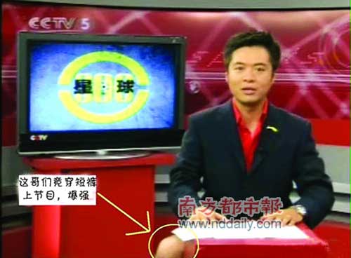 2007年8月13日,在直播《天下足球》時,上半身身著西裝的主持人段暄卻在播音桌下伸出一條沒穿西褲的腿。