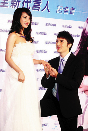 蔡依林前天為洗發水代言披婚紗,化身美嬌娘的她與廣告中的男友舉辦世紀婚禮。廣告中的帥哥男友下跪幫她戴婚戒,蔡依林感覺自己很幸福。