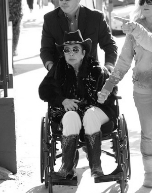 好萊塢“玉婆”伊麗莎白·泰勒19日坐著輪椅來到一家修道院。“玉婆”頭戴牛仔帽,鼻梁上架著一副太陽鏡,鮮紅的唇膏把臉色襯托得更加蒼白,與昔日搖滾天王邁克爾·杰克遜慣常的裝扮如出一轍。