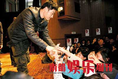 黃維德在舞臺上盡顯偶像風采,中途更深入到群眾中去,和大學生握手互動,做男人難,做“小三男”其實不難。