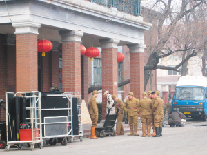 除了道具和布景以外,另一邊演員和造型師也忙得不可開交,記者在現(xiàn)場(chǎng)看到,造型師正一遍又一遍地檢查著各位演員的服飾和妝容,并且還要對(duì)每一雙鞋進(jìn)行做舊處理,以達(dá)到最佳拍攝效果。當(dāng)看到幾位群眾演員的軍裝領(lǐng)口,露出不符合時(shí)代背景的內(nèi)衣后,就立刻要求他們脫下。記者看到,就連每一位群演的化妝也都細(xì)致入微,有的因?yàn)橐{(diào)整膚色將粉底涂至脖子根部,有的被化妝師在臉上做出了好似疤痕的效果,更有甚者,因?yàn)榘l(fā)型不符合電影故事發(fā)生年代,竟被發(fā)型師當(dāng)場(chǎng)剃成“板寸”。記者在現(xiàn)場(chǎng)還看到幾位候場(chǎng)的日本演員,敬業(yè)的他們?cè)陂_拍前很久便開始對(duì)著鏡子反復(fù)練習(xí)。