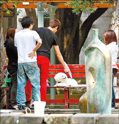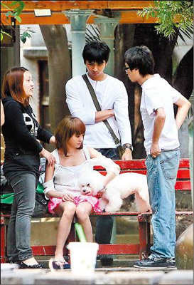 Jolin在片場認真演出,她的狗兒子“屋虎”也有專人照顧,坐在木椅上還有人為牠扇風解熱,Jolin一有空也不忘關心狗兒子,坐在木椅上逗弄愛犬。