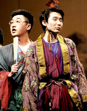 在前天的演出中,飾演三皇子的80后演員孫曉鵬的表演最為賣力,臺詞幽默、時尚。據(jù)記者統(tǒng)計,他出場時觀眾笑場多達19次。