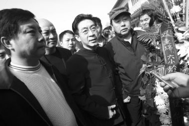 上午10點告別儀式開始,人們排成長隊井然有序地進入靈堂。閆懷禮的遺體安臥在花叢中,面容安詳!吧窕觌x去芳名百世著清風,音容宛在勤奮一生傳佳話”的挽聯十分醒目。靈柩旁,六小齡童、遲重瑞、馬德華等《西游記》主創垂淚站立。當《西游記》主題曲《敢問路在何方》在靈堂響起,眾人嗚咽聲一片。