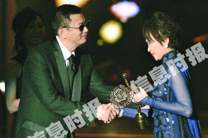 湯唯自從成為香港人之后久未露面,前日,一身火紅晚裝的她從紅地毯到頒發(fā)新晉導(dǎo)演和最佳新演員獎,甚至回答內(nèi)地媒體的普通話提問時,湯唯都始終講粵語。而在紅地毯上,主持人錢嘉樂笑言聽說湯唯最近粵語精進,于是給了她一個秀粵語的機會跟現(xiàn)場觀眾打招呼。湯唯與劉美君在頒獎時,有段大談新人經(jīng)歷的對話,劉美君說:“現(xiàn)在好多新人都是泥,還要是爛泥扶不上壁,真是好慘。”不過TVB在轉(zhuǎn)播時刪去了這段對話。
