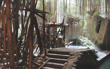 洞內燈火通明,卻很陰冷潮濕,時不時聽到滴滴答答的水聲,十幾個工人正在忙碌著趕制道具。一位工人師傅告訴記者,“我們已經在這里忙活兩個月了,洞內的所有木頭橋、破房子、還有垂掛下來的藤條等等,全是人工打造的。”
