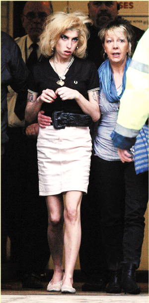美國(guó)有“癲后”布蘭妮長(zhǎng)期霸占娛樂(lè)版面,英國(guó)則有“毒后”艾米·懷恩豪斯制造新聞點(diǎn)。上周五她在審訊結(jié)束前5分鐘趕到法庭,為被控傷人及行賄等罪名的25歲老公Blake打氣,還公然于庭上高喊:“老公我愛(ài)你!你是最靚仔有型的!”送給Blake一顆定心丸,有目擊者就表示,Blake隨即以口形回應(yīng):“你怎樣啦?”艾米只懂不斷重復(fù):“愛(ài)你!愛(ài)你!”恩愛(ài)得旁若無(wú)人。不過(guò)艾米當(dāng)天邋遢異常,蓬頭垢面甚至穿著殘舊芭蕾舞鞋就來(lái)到法庭了。