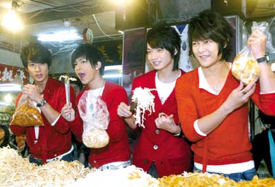 2月1日,臺灣超人氣偶像團體飛輪海,抽空逛臺北迪化年貨大街。四人以大紅裝扮配合過年喜氣,最后在勝益食品挑戰(zhàn)成為叫賣銷售員,為了比拼,飛輪海不惜出賣色相誘歌迷掏錢買年貨,2分鐘就替店家賣了2500元,讓工作人員笑稱色相出賣得很值。