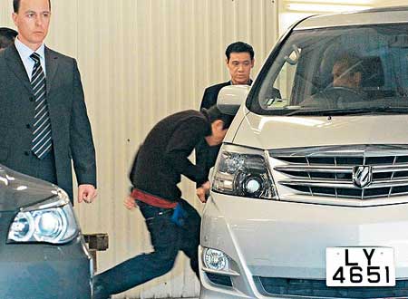 中新網(wǎng)2月27日電 陳冠希昨午2時許再由四季酒店出發(fā)到灣仔警察總部協(xié)助調(diào)查艷照事件。據(jù)香港媒體報道,十多名酒店保安在酒店停車場維持秩序,陳冠希快速步上保母車離開,八名保鑣則乘坐兩輛房車為他護(hù)航。