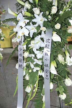 據(jù)香港明報報道,肥姐前夫鄭少秋沒有親自到場送別,但也有送花圈悼念。他所送的花圈以白色為主,包括白玫瑰、白百合、白蘭花及白色馬蹄蘭,花圈上寫上“沈殿霞小姐安息,鄭少秋敬挽”。