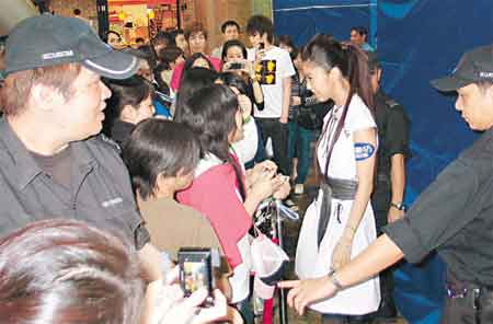 現(xiàn)場吸引逾百歌迷和途人圍觀,非常熱鬧!Fiona雖然是傳媒焦點,但聲勢卻不及Janice Man強勁,其Fans還提早到場霸好前排有利位置,而Fiona的Fans被擠出外圍,只能在后排高舉海報助威,儀式結(jié)束后,F(xiàn)iona即主動走近圍欄替他們簽名合照,挽回人氣。