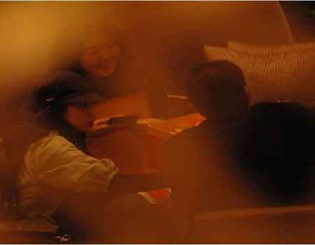 羅伯·明可夫朝靠窗處走去,此時,回頭的李冰冰剛好讓記者看了個仔細。簡單的寒暄過后,羅伯·明可夫靠窗位置坐下。為了更仔細的觀察到二人當時的情況,記者轉身上到二層找尋最佳位置取證拍照,在鏡頭中,起初李冰冰與旁邊的助理不時拿出一些照片和資料給羅伯·明可夫看,李冰冰還不時用手指著一些照片在解釋什么,雖然羅伯·明可夫似乎沒有太多肢體上的語言,但從李冰冰手舞足蹈的表現中,可以看出二人交流的很愉快(看來李冰冰的英語練得不錯)。交談的過程中,羅伯·明可夫不時手托著下巴認真聆聽,不時談笑風生,在隨后的時間里,雙方似乎達成了某些事宜,李冰冰與助理很認真的說著某事情,而羅伯·明可夫則坐在一旁開始玩弄手機,偶爾加入到李冰冰與助理的談話中。