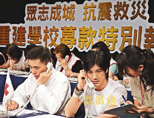 中新網5月19日電 據香港《文匯報》報道,臺灣藝人舉辦籌款賑災晚會 “眾志成城抗震救災,重建學校募款特別報道”節目,于前晚播出。歷經4個小時的募款,共募得3千9百多萬元。適逢當晚是王力宏32歲生日,對有份到場演出的Leehom來說特別有意義。