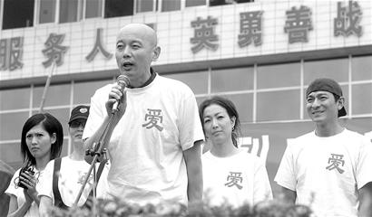 作為活動(dòng)的發(fā)起人——四川女婿張國(guó)立用四川話鼓勵(lì)大家:“大家辛苦了!地震雖然摧毀了我們的家園,我們可以建設(shè)更好的家園,天災(zāi)雖然無(wú)情,但是我們?nèi)硕加星椤N覀円黄鸷八拇佑停∷拇ㄐ燮鸸 爆F(xiàn)場(chǎng)每一個(gè)人都高舉右手,高呼:“四川加油!四川雄起!” 記者馬丹 攝影劉亮