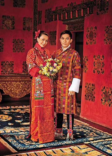 “偉玲”在不丹結婚成為當地一件盛事,不丹王室更特別打破慣例,提供皇宮的寢室給新人拍婚紗照,并由不丹皇叔夫婦(即將登基國王之叔)親自為這對新人著裝,據了解,偉仔的禮服正是當年皇叔結婚所穿的禮服,而嘉玲所穿的禮服則是王妃他們為年僅兩歲的女兒日后出嫁所準備的嫁衣。