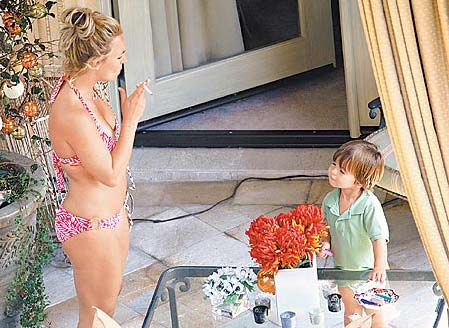 中新網7月22日電 “小甜甜”布蘭妮(Britney Spears)行使探視權和兒子見面,卻被拍到穿著比基尼在將滿3歲的大兒子西恩(Sean Preston)面前吞云吐霧,難怪在爭奪兩個兒子監護權的官司中輸給前夫凱文費德林(Kevin Federline)。