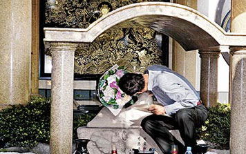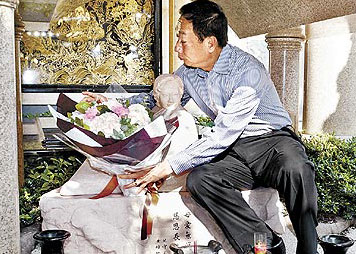 昨天下午4時,身著長袖襯衫搭配西裝褲的郭臺銘搭乘奔馳車出現(xiàn),進入墓園后,郭臺銘神情肅穆,開始打理祭拜亡妻的儀式。他將一大束鮮花小心翼翼地放在愛妻雕像邊,并在墓前擺上愛妻生前愛吃的四季豆干面和涼拌小黃瓜,一切擺妥,他溫和地請記者退開些,讓他有機會和愛妻獨處。