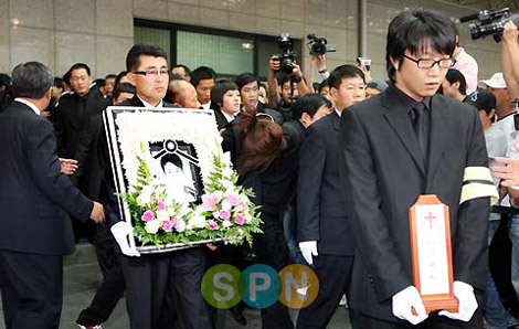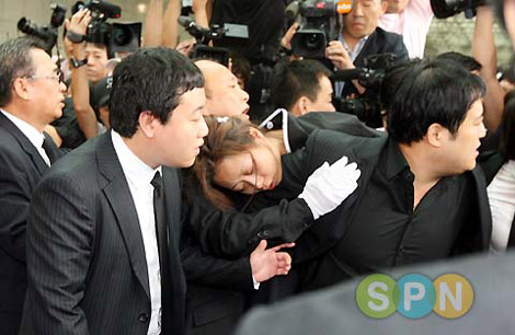 演員安在煥的出殯儀式于11日早晨8時在首爾江南圣母醫(yī)院殯儀館舉行,妻子鄭善姬再次暈倒,令現(xiàn)場人員難過萬分。(圖片來源:Edaily SPN)
