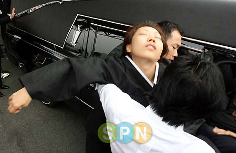韓國Edaily SPN報道,在11日舉行的出殯儀式上,安在煥的妻子鄭善姬再次暈倒,令現(xiàn)場人員難過萬分。