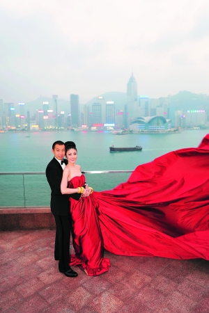 奚仲文說,“kelly想有一套比較夸張的婚紗給記者拍照,碰巧Lusan Mandongus工場肯人手趕制一件,構思是配合洲際酒店的長云石樓梯。頭紗從英國訂過來,長15米左右;婚紗布料則從法國運過來,從最初的12米改成6米多。最初鋪了上千朵牡丹,但鐘珍說999朵好意頭,這衫足足做了一個多月。”