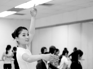 白晶在學校的練功房進行形體訓練,打好進娛樂圈的基本功