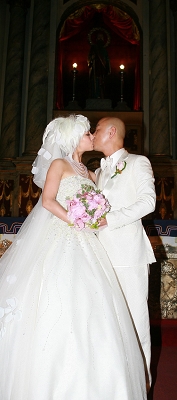 昨天,愛情長跑10年的張衛(wèi)健與張茜在始建于1571年的菲律賓著名景點圣奧古斯丁大教堂舉行了婚禮。香港驕陽電影公司總裁徐小明為兩人證婚,而作為兩人共同好友的李靜和戴軍則出任大婚司儀。在婚禮上張茜身穿一件拖尾純白裹胸婚紗,上半身有5000顆水晶點綴,造型別具一格。在婚禮中,一對新人在親友面前熱吻一分鐘,張茜還兩度喜極而泣。