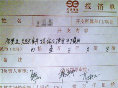 這份報(bào)銷單中,開支內(nèi)容一欄寫的是“陳楚生失蹤事件媒體及博客寫手費(fèi)用”,部門負(fù)責(zé)人審核一欄簽有天娛傳媒宣傳總監(jiān)吳夢知的名字,公司領(lǐng)導(dǎo)審批則有天娛總經(jīng)理龍丹妮和天娛副總楊柳的簽名。