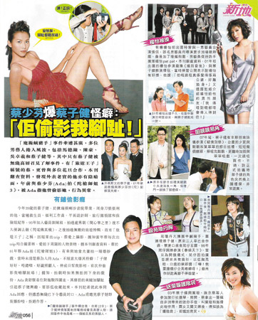 今年39歲的蔡子健,進(jìn)入演藝圈之前曾當(dāng)過(guò)救生員、福利工作者、平面設(shè)計(jì)師、旅行團(tuán)領(lǐng)隊(duì)和保險(xiǎn)經(jīng)紀(jì)等,1993年加入無(wú)線藝員訓(xùn)練班,拍完情景劇《開(kāi)心華之里》后不久便被調(diào)去主持《閃電傳真機(jī)》節(jié)目,之后拍過(guò)無(wú)數(shù)旅游特輯,故有“旅游王子”之稱(chēng)。因經(jīng)常出差,他愛(ài)上攝影。據(jù)資料顯示,2001年,蔡子健與蔡少芬合拍《陀槍師姐3》時(shí),兩人演夫妻拍一場(chǎng)婚紗戲。當(dāng)時(shí)蔡少芬不經(jīng)意地大爆蔡子健的怪癖:“子健人不錯(cuò),很懂得照顧人,還整天幫我照相,有一次還偷拍我的腳趾!”據(jù)知,拍劇時(shí),蔡少芬經(jīng)常貪舒服穿著拖鞋到處走,其修長(zhǎng)的美腿和腳趾引起蔡子健的興趣,所以拍下來(lái)作收藏。近日,記者就此事詢(xún)問(wèn)蔡少芬,但據(jù)悉無(wú)線已下令藝員“封口”,蔡少芬對(duì)關(guān)于蔡子健的問(wèn)題立即裝聾扮啞,拒絕作答。