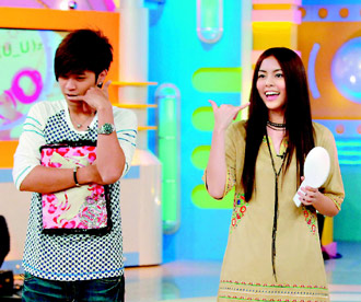 任容萱(右)在《娛樂百分百》中玩打電話游戲,小豬(左)直呼聲音與Selina超像。