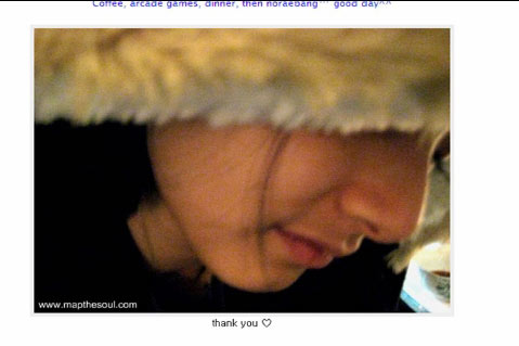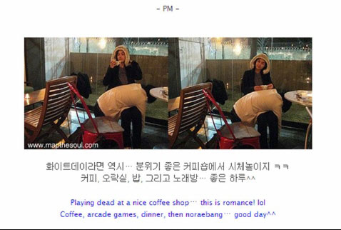 Tablo在上傳照片后,還寫了照片說明。他寫到:“白色情人節,理應在氣氛浪漫的咖啡屋裝出死人的樣子,呵呵,咖啡、娛樂室、吃飯,還有練歌房,快樂的一天^^。”回顧了當時幸福的樣子。