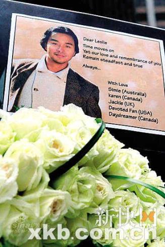 張國榮(哥哥)的歌迷昨天在香港文華東方酒店外舉行悼念活動(dòng),紀(jì)念哥哥去世六周年。事發(fā)地?cái)[滿歌迷自發(fā)送來的各式鮮花。3月31日上午11時(shí)開始,便有歌迷從上海、臺(tái)北,日本、美加、英國、澳大利亞等地趕到文華東方酒店向偶像悼念,并送上心形花牌給哥哥。
