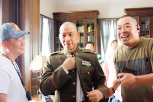 昨天上午,剛剛從上海趕到天津的王學圻直奔《建國大業》在河北區梁啟超飲冰室搭建的片場,拍攝“李宗仁會見司徒雷登”一場戲,飲冰室內部的閣樓布置成司徒雷登的辦公室。和導演黃建新做了簡單的溝通后,王學圻和扮演司徒雷登的演員開始試拍。在監視器中,身著國民黨軍裝的王學圻老成干練、威風凜凜,這場戲是李宗仁以私人身份要求獲得杜魯門政府的支持,卻遭到了拒絕。王學圻表現得不卑不亢,將焦點轉移到了扮演司徒雷登的非職業演員身上,導演黃建新告訴記者,這位扮演司徒雷登的演員本是在中國發展的美國商人,一次偶然的機會讓他加盟劇組,到目前為止的表演令人很滿意。而在實力懸殊的對陣中,“司徒雷登”卻顯得有些緊張,有兩次還說錯了臺詞,稍加穩定之后,最后一條終于通過。黃建新導演高興地告訴和王學圻擁抱一起的“司徒雷登”,“這是天津的記者,你們快拍一張合影,這樣你就上報紙啦!”