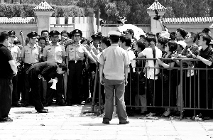 在安排群眾進入追悼會現場時,由于悼念群眾人數眾多,現場秩序一度混亂。一直代表央視維持秩序的郎永淳再次站出來,代表家屬向未能進場的群眾表示道歉,并兩次鞠躬?吹饺绱苏\意,群眾才開始慢慢退場。據現場工作人員介紹,共有9000左右的人進入到靈堂悼念,而來到現場的人則有上萬。