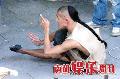 謝霆鋒在片中是一個(gè)拉黃包車的“車夫”,“六義士”之一。他在片場(chǎng)表現(xiàn)極其活躍,不僅主動(dòng)找人“挑戰(zhàn)”,還積極練功,一絲也不懈怠。自從結(jié)婚生孩子后,謝霆鋒就自作主張轉(zhuǎn)型成“動(dòng)作演員”了,每部戲就力求從頭打到尾。動(dòng)作戲,時(shí)間短,片酬高,誰都愛接(詳情請(qǐng)參閱本期重點(diǎn))。問題是謝霆鋒原本是個(gè)摔吉他的,現(xiàn)在換了要打架摔跤,基礎(chǔ)略有些薄弱。為此謝霆鋒一直孜孜不倦,努力學(xué)習(xí),在片場(chǎng)看見熟悉的武行就要和對(duì)方“套招”,大家都不理他了,他還一個(gè)人玩起撐地踢腿。通過努力鍛煉,謝霆鋒的功夫的確見長(zhǎng)。