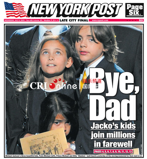 2009年7月9日訊,洛杉磯,當地時間7月7日,流行音樂之王邁克爾·杰克遜(Michael Jackson)的公眾悼念儀式在美國洛杉磯的斯臺普斯體育中心舉行。當地時間7月8日,《紐約郵報》把杰克遜三遺孤的合影當做封面,孩子們泛紅的眼圈,哀傷的神情令人心酸。