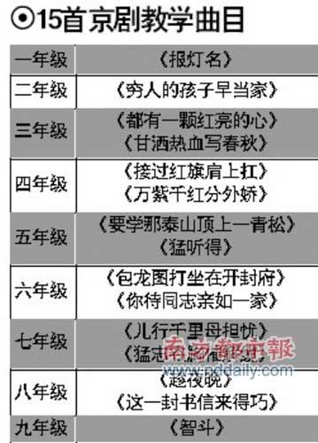 昨日廣東省教育廳體育衛(wèi)生與藝術(shù)教育處副處長何志強告訴記者,他剛剛看到了教育部的文件。要求是每省選擇一個重點市開展試點,每省選20所學(xué)校,分別是10所小學(xué)和10所初中,在音樂課程中增加京劇曲目教學(xué)。教育部要求從2008年3月到2009年7月在北京、天津、黑龍江、上海、江蘇、浙江、江西、湖北、廣東、甘肅等10省市開展試點工作,并在試點的基礎(chǔ)上逐步在全國推開。