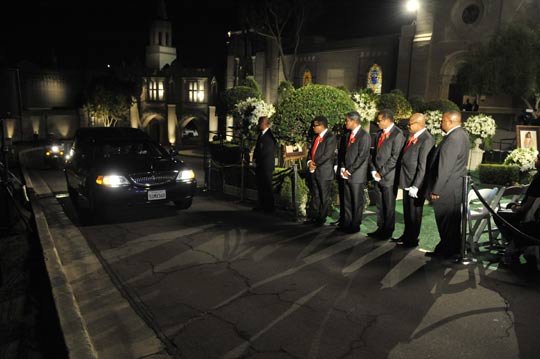臺灣TVBS消息,白色的鮮花將杰克遜的葬禮布置得莊嚴素雅,棺木旁還有一幅杰克遜的畫像。包括玉婆伊麗莎白.泰勒,還有麥考利.金都紛紛出席,要送杰克遜最后一程,但是杰克遜的家人卻延遲了1個多小時才出現,也讓原本要在北京時間10點舉行的葬禮,一直到11點才開始。