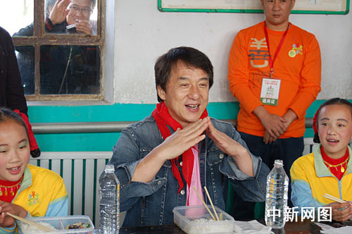 臨近午飯時分,成龍與十幾名小學童每人領到了一盒香菇炒油菜和白米飯的盒飯,在一間簡陋的教室里津津有味地吃了起來。雖然是頭一次與國際巨星成龍在一起吃飯,可這些鄉村娃娃卻一點也不怯場,好奇心驅使他們左一個問題右一個問題問個不完。而成龍卻面帶笑容地邊吃邊聊,將他的成長經歷和成功經驗耐心地一一解答。眾學童聽完后,紛紛夸“成龍叔叔好棒!”