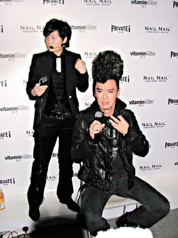中新網12月11日電 前晚鐘鎮濤和郭富城緋聞女友王秀琳等人在香港出席發型活動,為了支持活動,大家的發型都十分夸張。鐘鎮濤不僅頭頂巨型雞冠頭,還自曝因女友懷孕,所以自己吃生發藥來壓抑欲望。