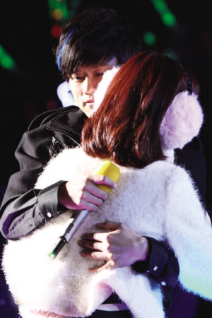 張杰與謝娜的戀情從2007年延續(xù)至去年,其間話題始終不斷,就在兩個月前,兩個人還傳出了分手的消息,但到了跨年演唱會當(dāng)晚,人們看到的依然是一如既往的甜蜜畫面:在演唱會的舞臺上,張杰深情地看著謝娜,還沒開始唱歌,謝娜的眼淚就已流了下來,接下來,張杰更現(xiàn)場改掉了《何必在一起》的歌詞,兩個人一起唱出了“我們要在一起”,當(dāng)張杰擁抱住已經(jīng)哭成淚人的謝娜時,場面被渲染得如偶像劇一般浪漫感人,粉絲更是尖叫連連。