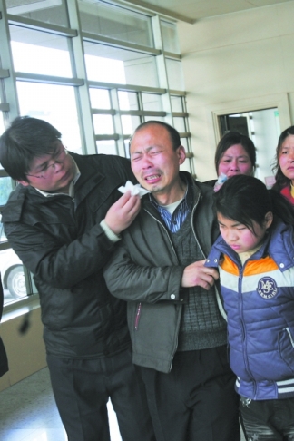 自從醫院方面向王成記透露李榮珍的病情繼續惡化后,一向很堅強的王成記仿佛老了10歲。雖然昨日換了一身干凈衣服,可是王成記兩眼無光,還沒走近重癥監護室已哭得死去活來。因為重癥監護室每次只能進兩個人,所以王成記的女兒、兒子以及親朋好友進去后,王成記才一個人走了進去。剛走到妻子的病床前,這個男人一下跪了下去,握緊著李榮珍的右手,淚流滿面。“你快點醒來,兩個娃娃還等著你,你不要睡了……”王成記的哭聲,讓現場的每個人都感到很難過。盡管媒體昨天報道李榮珍已經腦死亡,但王成記表示醫院并沒有向他出示腦死亡的證明,雖然他也表示妻子生存的幾率很小。王成記與家人商量后,表示將繼續醫治妻子,希望能夠出現奇跡。