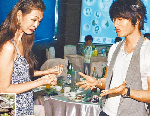 中新網7月23日電 偶像劇《泡沬之夏》前晚舉行殺青酒,演員喝酒high翻天,完全顧不得形象,黃曉明被拱上臺與何潤東(Peter)大跳韓國團體Super Junior的《Sorry,Sorry》,還與林嘉綺劃數(shù)字拳拼酒,她竟不顧名模形象突然露出《侏羅紀公園》里迅猛龍模樣,玩得十分投入。唯一全身而退的是大S,但她也不好過,因拍殺青戲時,她被何潤東撞到脖子扭傷,只能上下動,不能左右動。